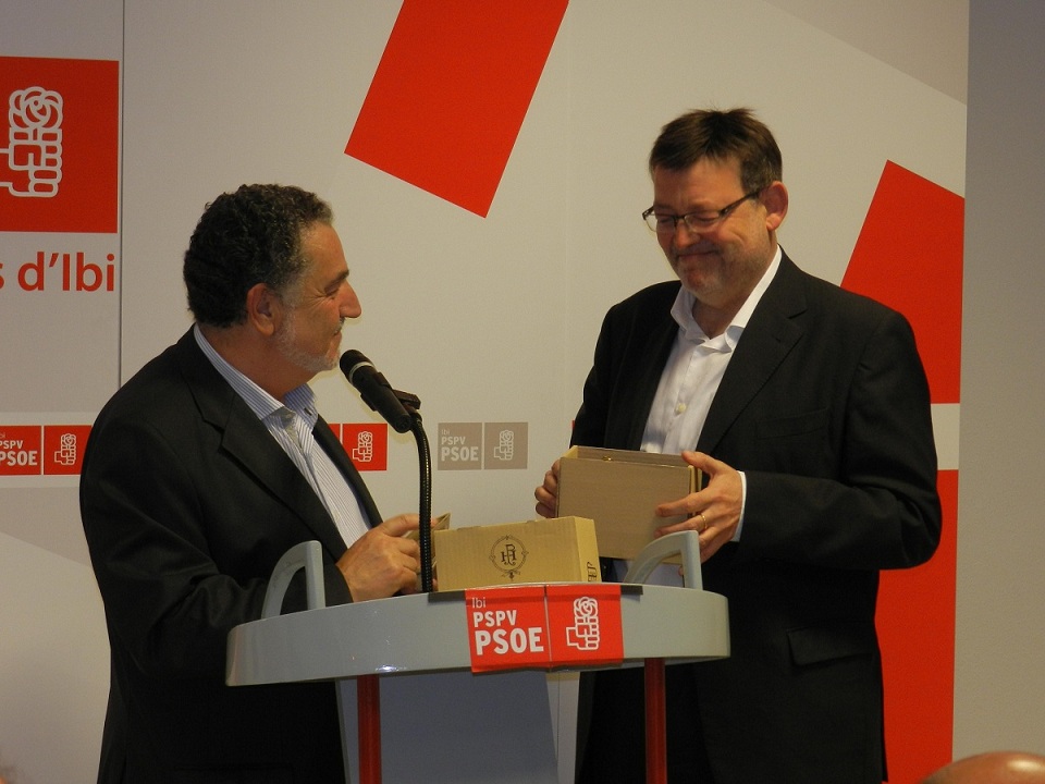 Al finalizar su intervención, Martos reclamó la presencia del Secretario General de los Socialista valencianos, Ximo Puig, al cual agradeció su asistencia y le hizo entrega de un juguete tradicional de Ibi de la empresa Payá, que simboliza la industria tradicional y el carácter creativo y emprendedor de los ibenses.