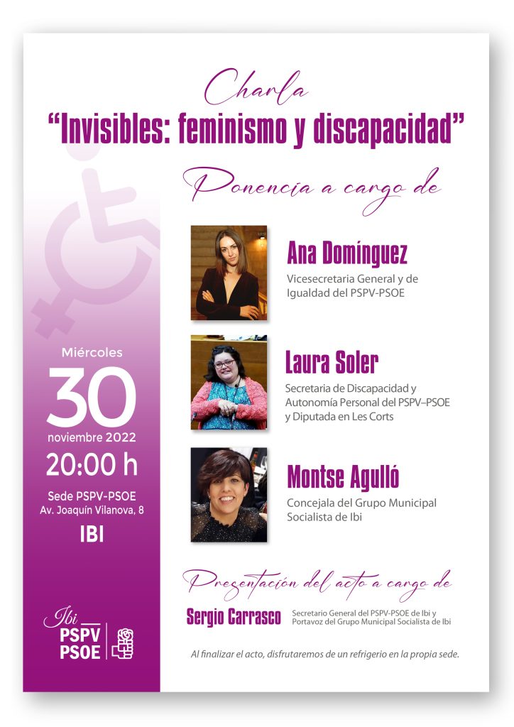 Dicha ponencia corrió a cargo de Ana Domínguez, Vicesecretaria General y de Igualdad del PSPV-PSOE, Laura Soler, Secretaria de Discapacidad y Autonomía Personal del PSPV–PSOE y Diputada en Les Corts y Montserrat Agulló, concejala del Grupo Municipal Socialista de Ibi y Secretaria de Inclusión Social de la Ejecutiva del PSPV-PSOE local.